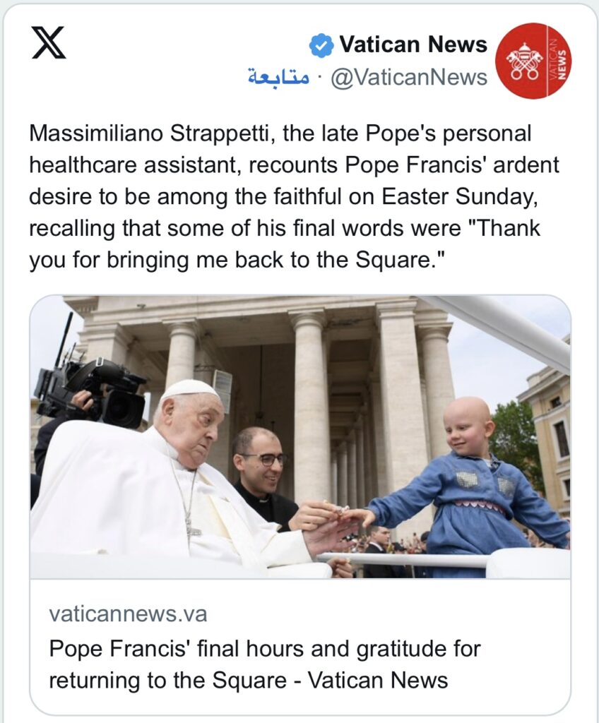 توفي البابا فرنسيس يوم الاثنين الماضي 21 ابريل إثر إصابته بجلطة دماغية تسببت في دخوله بغيبوبة وفشل في الدورة الدموية للقلب، حسب شهادة الوفاة التي أصدرها الفاتيكان.
