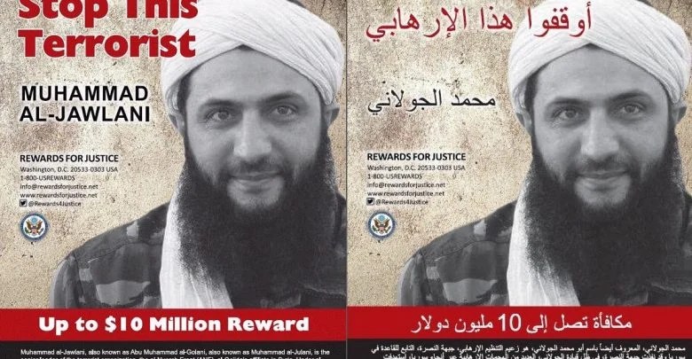 في عام 2013م أصدرت وزارة الخارجية الأمريكية بيانا سمت فيه الجولاني بالارهابي العالمي، ورصدت نحو عشرة ملايين دولار كمكافئة لأية معلومات عنه.